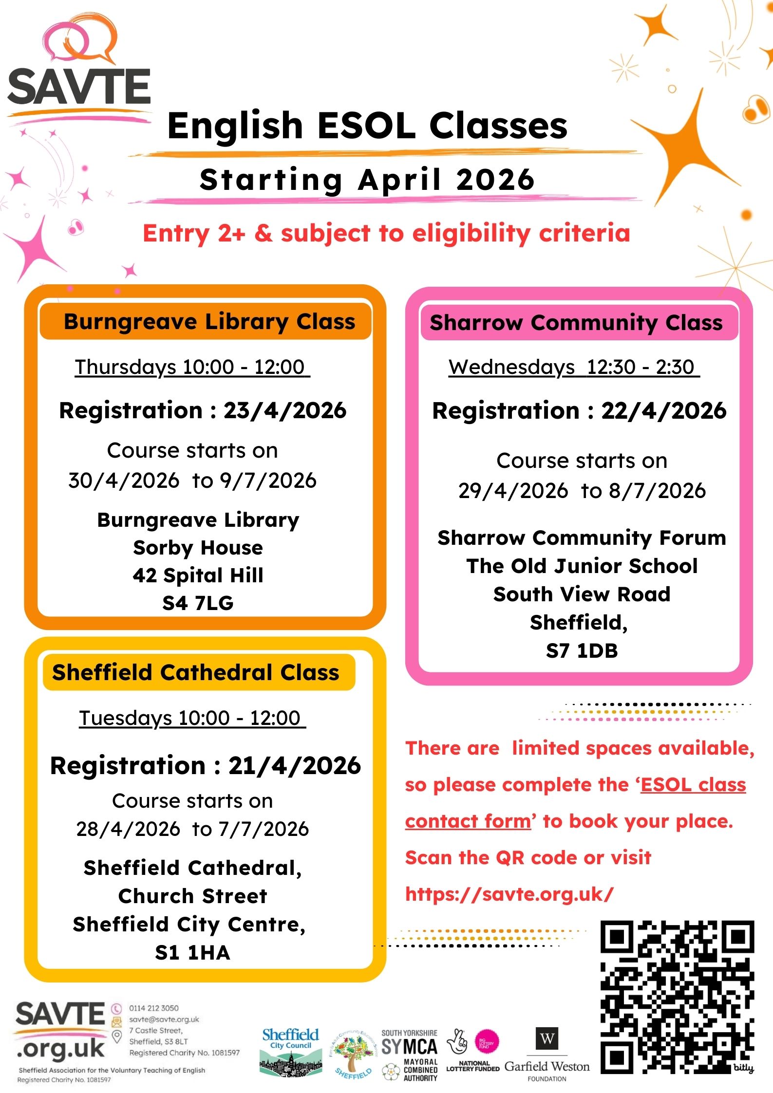 Entry level 2-3 ESOL, 8-10 week programmes at Sheffield Cathedral, Burngreave Library and Sharrow Community Forum